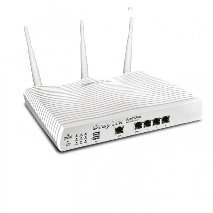 The DrayTek Vigor2132 high-performance router is developed in compliance with the super-fast broadband architecture. Vigor2132 features 1x Gigabit WAN port, 4x Gigabit LAN ports and integrated wireless access point. There are also 2 USB ports for a printer or network storage, which allows file sharing on the local network. In addition, the support of 802.1Q VLAN on WAN and LAN enables the router to provide triple-play services. Through the combination of Gigabit WAN and LAN ports, the downstream data and voice packet can be flawlessly delivered.
