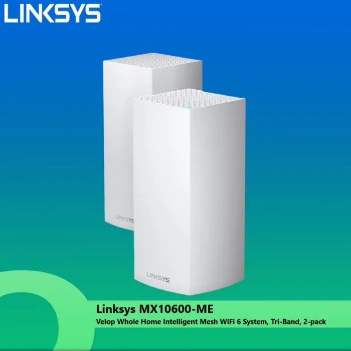 The Linksys Velop Whole Home Intelligent Mesh WiFi 6 (AX5300) System, Tri-Band, 2-pack (MX10600) is WiFi amplified, delivering more speed, coverage, and capacity than any WiFi technology has before.