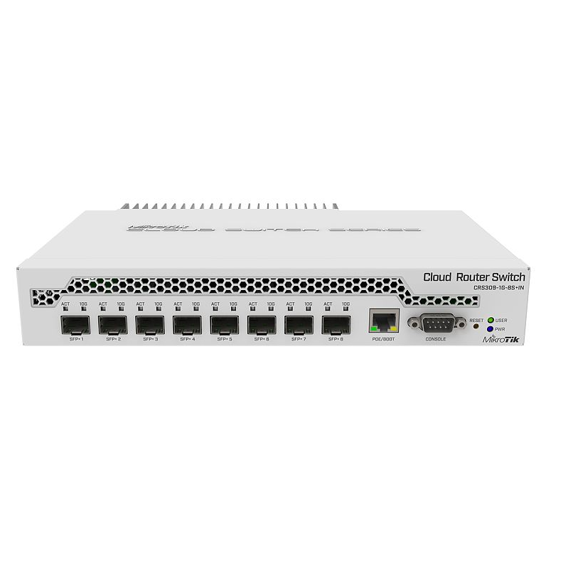 The CRS309-1G-8S+ is a very compact, yet powerful networking switch. It has eight SFP+ slots, supporting up to 10 Gbit module in each, which results in a total switching capacity of 162 Gbps and total non-blocking throughput of 81 Gbps.