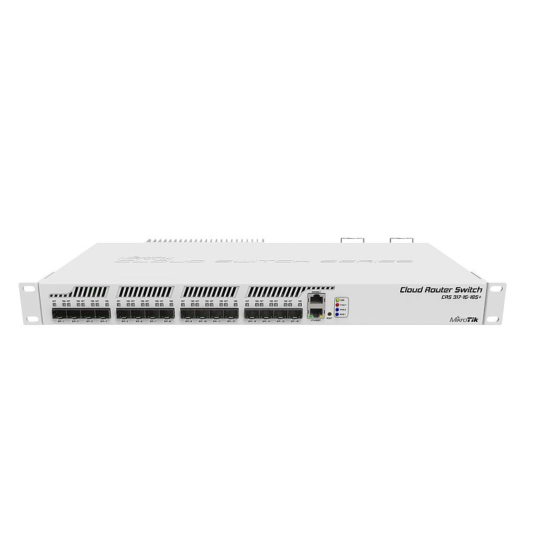 The new Cloud Router Switch 317-1G-16S+RM is a rack-mountable manageable switch with Layer3 features, it has 16 SFP+ ports for high performance 10GbE connectivity and a 1GbE copper port for management.