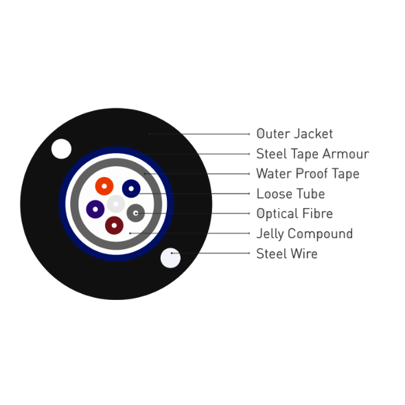 These cables are constructed with a central tube filled with water blocking jelly, water blocking tape over the tube giving it excellent water and moisture resistance. A corrugated steel armouring and two steel wires strengthening within the outer PE sheath give this cable excellent tensile strength, mechanical and environmental protection. They have a small diameter, is lightweight and is installation-friendly since they come in a single tube with loose tube fibre count up to 12 fibres. Their compact construction protects the loose tube from shrinking, the Armour makes it crush, rodent and impact-resistant, the waterproofing tape and jelly protects it from water and moisture, the outer PE sheath gives it ultraviolet protection. This cable is suitable for external distribution through ducts, conductor aerial pipelines